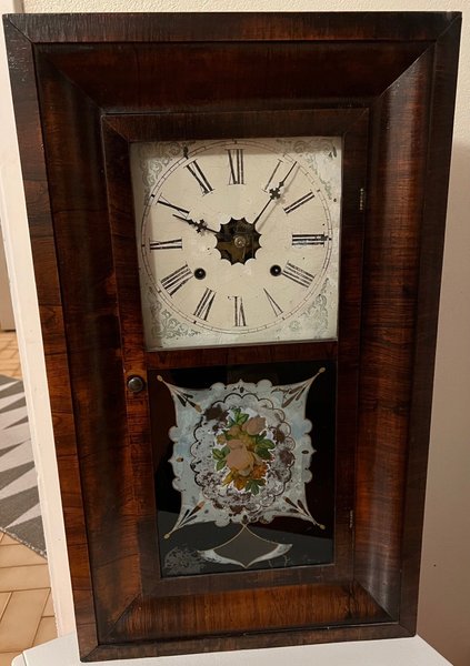 Väggklocka med romerska siffror och detaljerad urtavla. Klockan har ett träfodral med en dekorativ glaspanel med blomstermotiv nedtill.