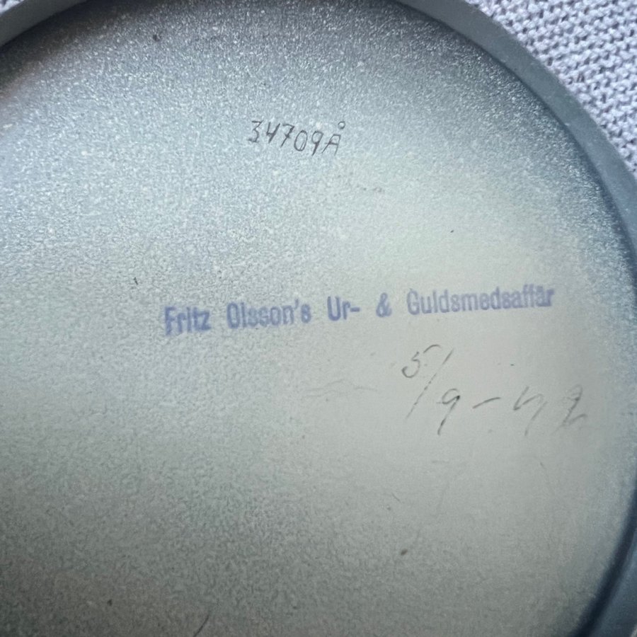 På insidan av bakstycket står det Fritz Olsson's Ur- & Guldsmedsaffär samt 34709A och 5/9-42.
