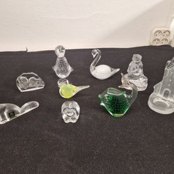 Set med fyra glasdjur figurer. Inkluderar en gul fisk, en bläckfisk, en haj (?) och en randig larv (?).