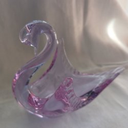 Svan i glas. Föremålet är blått med bubblor i glaset. Svanen är 17 cm lång.