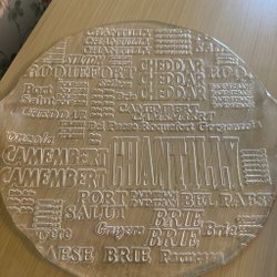 Ostbricka i glas med olika ostsorter som brie ost, roquefort ost, herrgårdsost, port salut ost och svecia ost.
