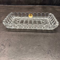 Fatet är genomskinligt med blå detaljer. Perfekt som dekoration eller serveringsfat.