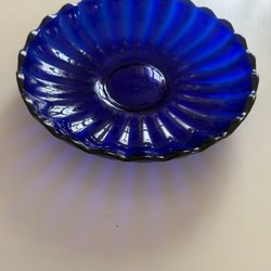 Avlångt glasfat med mönster i botten och vågiga kanter. Etikett med texten "FOREIGN" och en "W" i en stjärna finns på ovansidan.