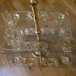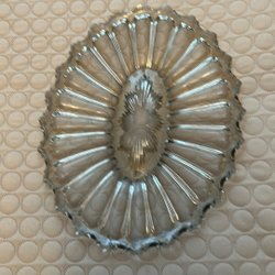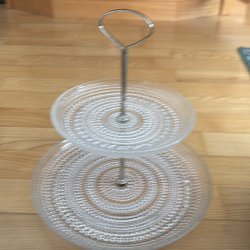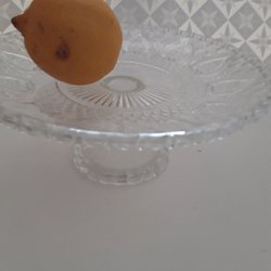 Kakfat i glas med en diameter på 23 cm och en höjd på 12 cm. Fatet har en vågig kant och ett mönster i glaset.
