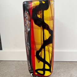 Glasvas Jugendstil Vit med vågmönster i gult och röd ovandel.