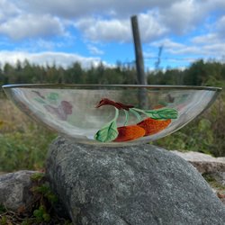 Stor pampig skål designad av Lennart Andersson Gullaskruf.Höjd 13.5 cm.Diameter 20.5 cm.Härligt mönster.