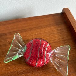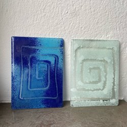 Ett par handblåsta glasdekorationer, avsedda att hängas upp. Det droppformade föremål är cirka 14cm x 10cm och det avlånga föremålet 25cm x 7cm stora. Förmodligen svensk design, osignerad .