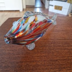 Vacker och färgglad glasfisk i Murano-stil. Fisken är tillverkad av glas med inslag av olika färger, främst rött, orange, gult, blått och vitt. Den har en elegant design och skulle vara en fin dekoration i hemmet.