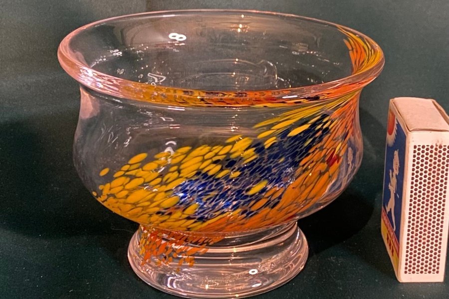 Skål i glas med dekor i gult, orange och blått.