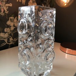 Stilren snygg glasvas med ett bubbligt mönster. Vasen är genomskinlig.