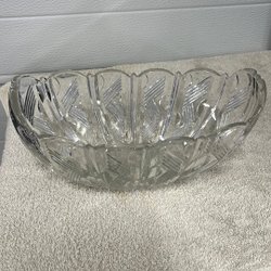 En glasskål i en mörkare färg. Skålen är oval och har en slät yta.