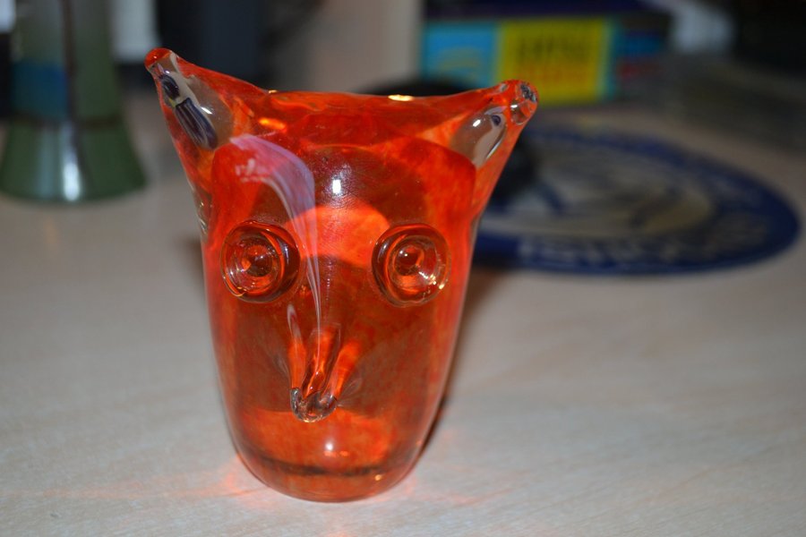 En orangefärgad glasuggla med detaljerade ögon och näbb. Ugglan har en unik design som fångar ljuset vackert. Viking glasowl USA 1960 talet. 9cm hög.