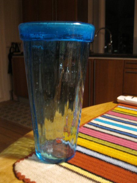 Dette er et blåt glas med en tyk kant. Glasset har en let bølget tekstur og små luftbobler i glasset. Det står på en træoverflade ved siden af en farverig stribet dækkeserviet.