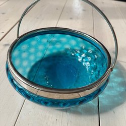 Dekorativ skål i glas med blå och gröna dekorationer.