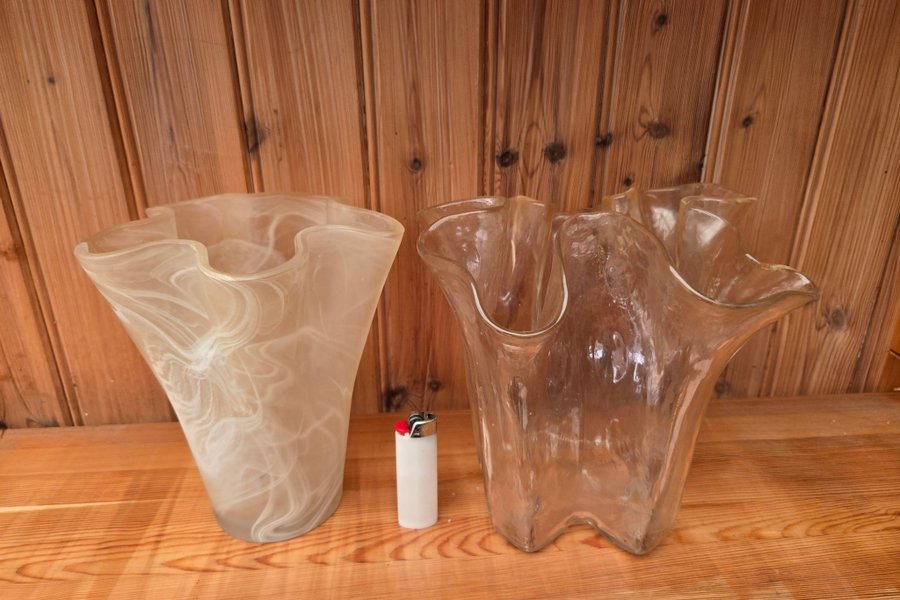 Två vaser i glas. En vas är i frostat glas med vita virvlar och den andra är i klart glas.