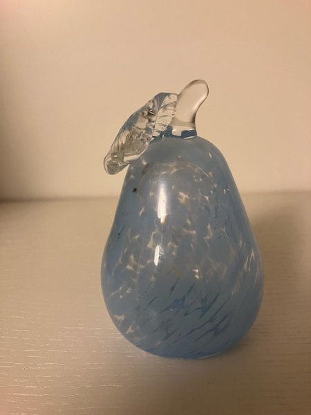 Prydnadspäron i glas. Päronet är blått med vita inslag och har en klar glaskvist.
