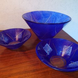 Skål från Nybro. Guldfärgad med ränder.