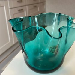 En blå skål med en räfflad nederkant. Skålen har en glansig yta och en mörkare kant upptill.