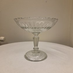 Sju glasskålar med en dekorativ fot. Skålarna är transparenta.