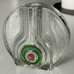 Grönfärgad glasskål med blommönster. Lys upp med UV-ljus.