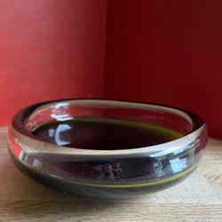 En glasskål med en texturerad yta och vågiga kanter. Skålen är transparent.