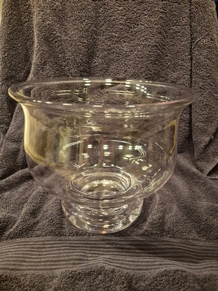 En glasskål med en bred öppning och en stabil bas. Skålen är transparent och har en klassisk design som passar för olika användningsområden.