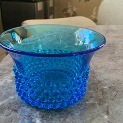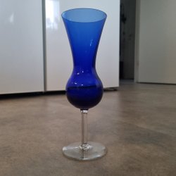 En blå vas i glas med vit insida som känns väldigt 70-tal.