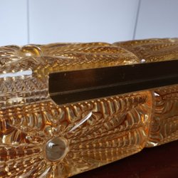 Äldre vas i rött glas med vita dekorationer under det yttersta klara glaset.