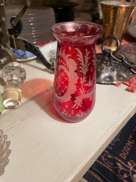 Röd vas med etsad dekor