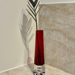 Fin turkos glasvas med genomskinlig fot. Retro. 60-tal? Gott bruksskick, några små repor finns. Luftbubblor sedan tillverkningen.