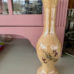 En fin vas med blommor. Den är vit med gröna blad och rosa blommor. Den är i bra skick.
