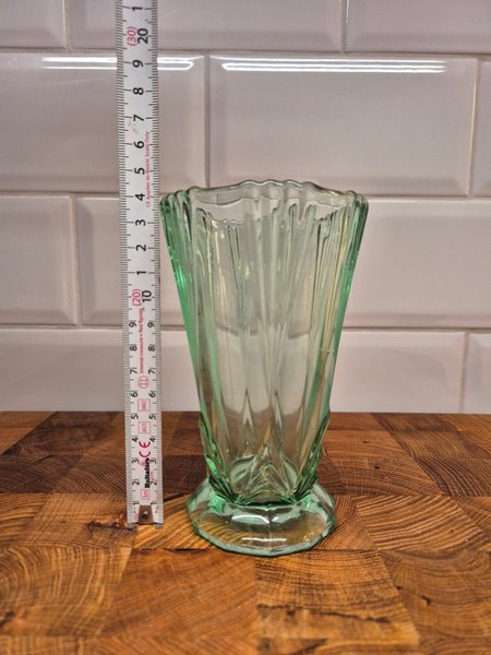 Stilren vas i lätt grönt glas med elegant, geometrisk form.
