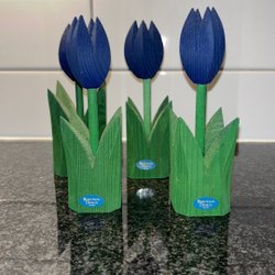 Handgjord i tjockt glas med mörkblå fot och blomformad topp i grönt glas.