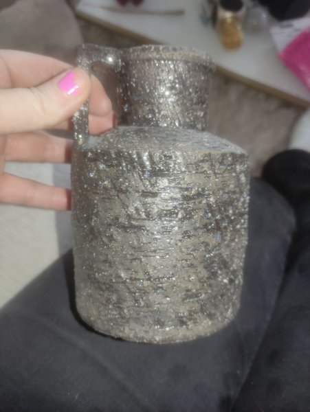 En glittrig vas med handtag. Vasen har en texturerad yta och är i en mörkare färg