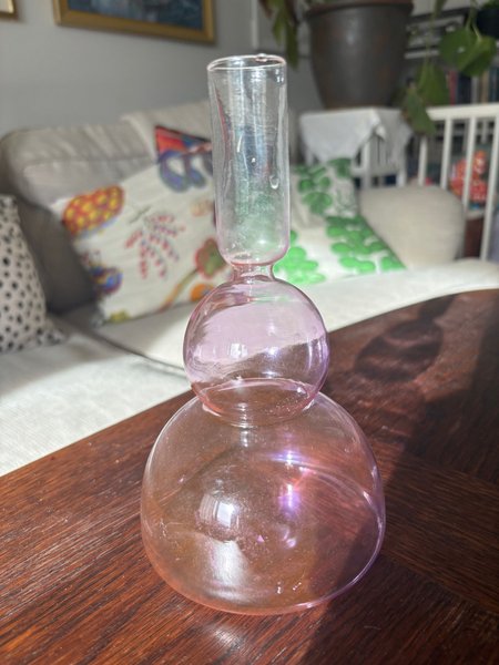 En rosa glasvas med en unik form, perfekt för att addera en färgklick till ditt hem. Vasen har en smal öppning upptill och en rundad bas.