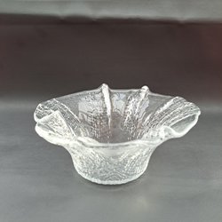 Dekorativ glasvas höjd 17 cm. Formen rundad nertill i "klyftor" och i halsen bubblor. Även bubblor runt nedre delen av vasen närmast botten. Diam upptill 6,5 cm och diam botten knapot 5,5 cm. Vikt 350 gram.