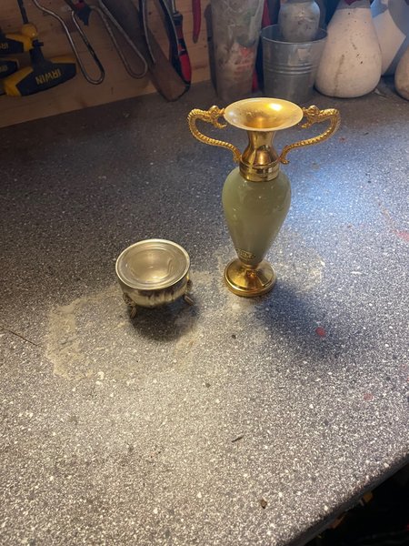 Vasen er grøn med guldfarvede detaljer og håndtag. Skålen er sølvfarvet med tre ben.