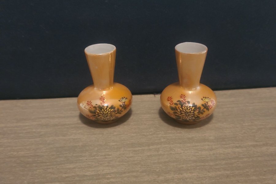 Två miniatyr vaser med ett blommönster.