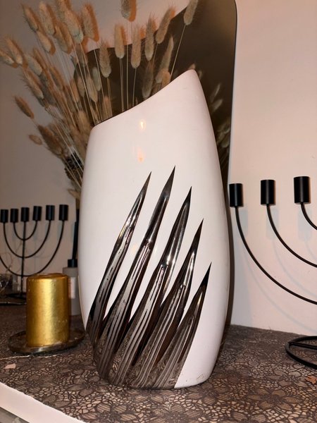 En vit vas med silverfärgade detaljer som ger en modern touch. Vasen har en unik form och passar bra som inredningsdetalj.