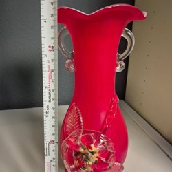 Vacker röd vas av glas, storlek ca 15 cm hög och 20 cm i diameter. Vet ej om den är munblåst, men den har ett sådant märke i botten (se bild) inget jag är säker på dock. Jag kan inte heller hitta någon stämpel eller märkning på vasen.