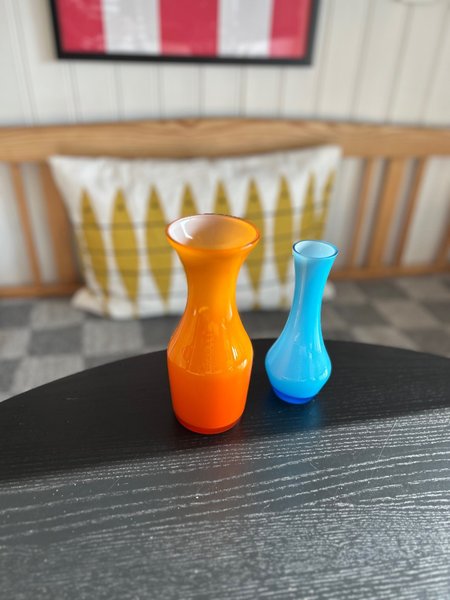 Två fina glasvaser i blått och orange.