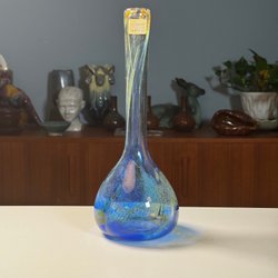 Ett par vackra bulbvaser i glas från 50/60-talet. En vas är i blått glas med infällning, den andra är i lila glas med klassisk bulb-form.