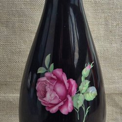 Blå vas etikettmärkt Signe Diebitsch Duka Halmstad. Vasen av för mig okänd tillverkare. Höjd: ca 24,5 cm. Blommans diameter: ca 8 cm. Vasens minsta diameter: ca 1,5 cm.
