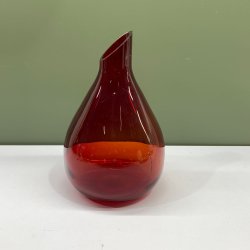 Glasvas i rött med vit insida. I mycket fint skick. Lite flammig i färgen från insidan, men inget som stör helhetsintrycket. Inga nagg. Ca 19cm hög och 8cm i botten.