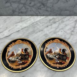 Ett par silverfärgade vaser. Den ena vasen har två handtag och den andra har ett handtag. Båda vaserna har en rundad kropp och en smalare hals. Dekorativa handtag.
