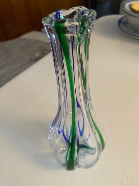 Vacker glasvas med blå och gröna ränder. Vasen har en elegant design och är perfekt för att visa upp blommor eller som en dekorativ inredningsdetalj. höjd 21 cm