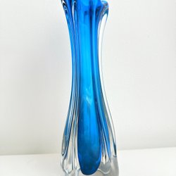 Denna Murano-vas är ett konstverk i glas, med en färgpalett som sträcker sig från en varm orange ton i basen, övergår till en mjuk vit i mitten, och avslutas med en livfull blå färg upptill. Vasens design är elegant med en böljande kant som ger den en unik och dynamisk form. Den är tillverkad med precision och visar upp det klassiska hantverket från Murano. Vasen är en perfekt inredningsdetalj som tillför färg och stil till varje rum.
