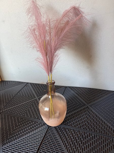 Pampasgräs i rosa nyans. Levereras med en vas i tonat glas. Passar som inredningsdetalj i hemmet.