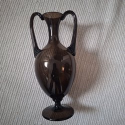En glasvas med ett detaljerat mönster. Vasen är 22 cm hög och har en diameter på 10 cm upptill. Den har texten "England" präglad i botten.