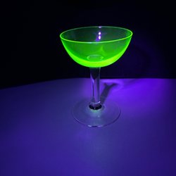 Snapsglas i uranglas med etsade vindruvor och blad, mycket fint skick inga nagg. Belyst med 395nm mått H 6,2cm Diameter 5,9cm.